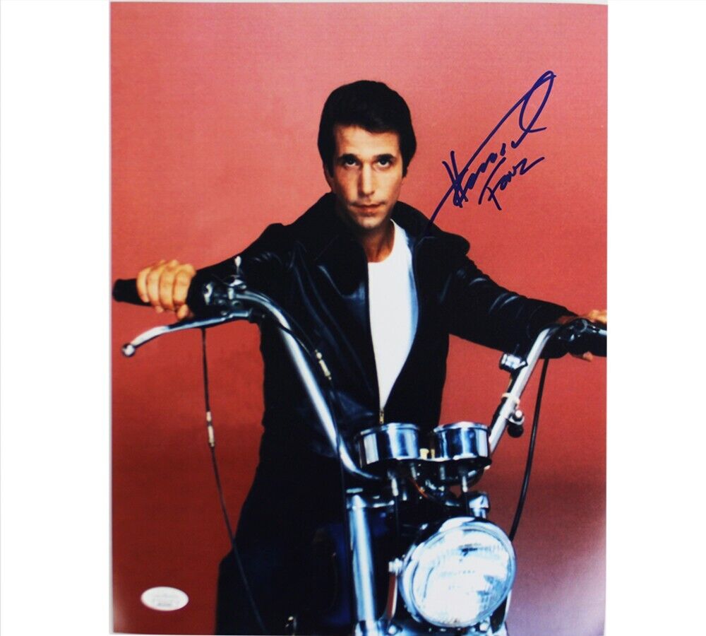 A Happy Days Unframed 11x17 Photo - Motorcycle hand signed by Henry Winkler. The item and signature are in excellent condition. Henry is an American actor, comedian, children's book author, executive producer, and director. Henry's American television series Happy Days winning 2 Golden Globe Awards and 3 Emmy Award nominations for Outstanding Leader Actor in a Comedy Series for the role. Henry also earned a nomination for the Golden Globe Award for best Actor. AUTHENTICATION: The item is accompanied by a JSA Certificate of Authenticity - JSA Serial Numbered & Databased Hologram