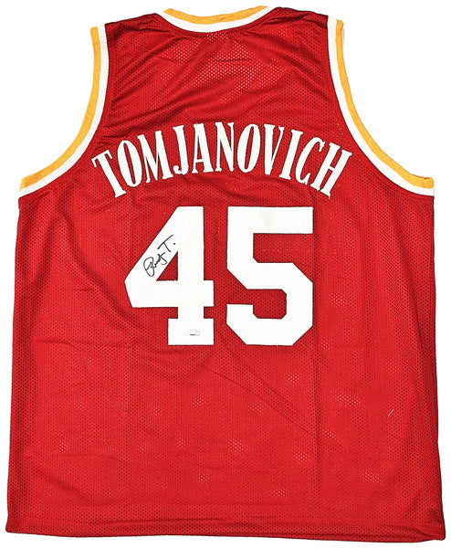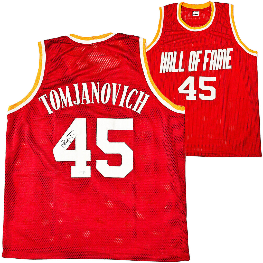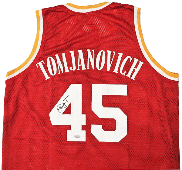 This is a Red Jersey that has been hand signed by Rudy Tomjanovich. This is a custom jersey with no name brand. The approximate size is XL. It has nice sewn in name and numbers.A This item has been certified authentic by TriStar and comes with their tamper-proof sticker and matching certificate of authenticity.