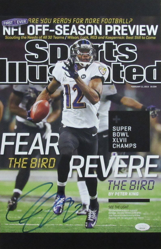 Jacoby Jones Signed/Autographed 11x17 Photo Baltimore Ravens. This photo is authenticated by JSA and includes their Tamper-proof Sticker and Certificate of Authenticity.