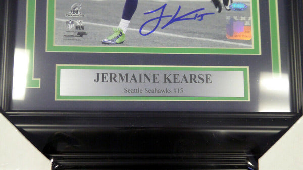 This is a framed 8x10 photo, approximately 15x18 with the frame, that has been hand signed by Jermaine Kearse. It comes with the tamper-proof Mill Creek Sports hologram and matching certificate of authenticity.