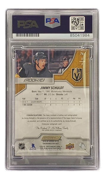Featured is a Jimmy Schuldt signed 2020 Upper Deck #76 Las Vegas Golden Knights rookie card. This card has been hand signed by Schuldt and has been authenticated and encapsulated by PSA. This card would make a great addition to any sports memorabilia collection. SPECIFICATIONS Autographed By: Jimmy Schuldt Team: Vegas Golden Knights Sport: Hockey Authentication: Professional Sports Authenticator (PSA)