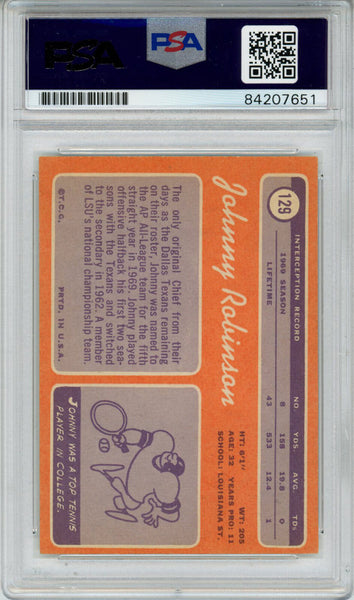 Johnny Robinson Autographed 1970 Topps #129 Trading Card PSA Slab 43643 The number in the listing title is just an inventory sku for our records and is not the authentication number. The item pictured is a stock photo unless otherwise noted. This is a trading card that was personally autographed by Johnny Robinson. This has been professionally slabbed by Professional Authentication Services (PSA) and includes a certificate of authenticity from Denver Autographs.
