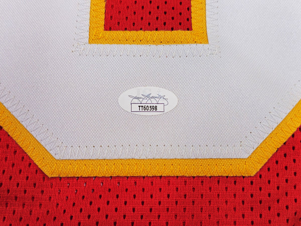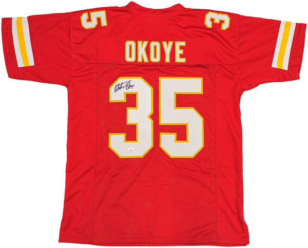 This is a Red Jersey that has been hand signed by Christian Okoye. This is a custom jersey with no name brand. The approximate size is XL. It has nice sewn in name and numbers. This item has been certified authentic by JSA and comes with their tamper-proof hologram and matching certificate of authenticity.