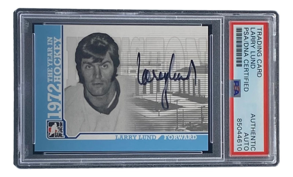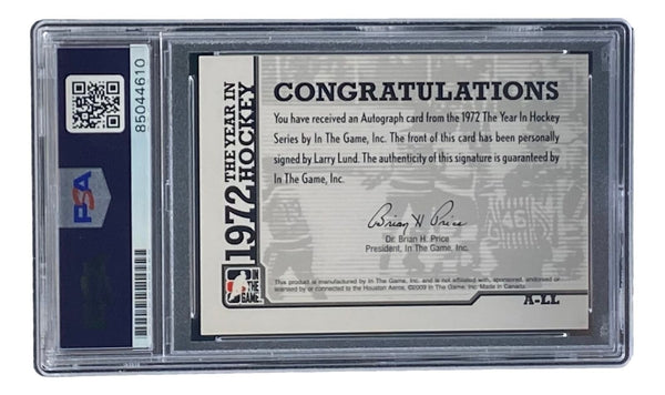 Featured is a Larry Lund signed 2009 In The Game #A-LL Houston Aeros trading card. This card has been hand signed by Lund and has been authenticated and encapsulated by PSA. This card would make a great addition to any sports memorabilia collection!. SPECIFICATIONS Autographed By: Larry Lund Team: Sport: Hockey Authentication: Professional Sports Authenticator (PSA)