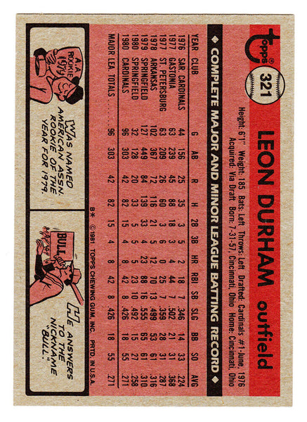 Leon Durham signed St Louis Cardinals 1981 Topps rookie baseball trading card #321. Item comes with a Schwartz Sports Memorabilia tamper-proof numbered hologram (on back of physical card) and Certificate of Authenticity which can be verified online.