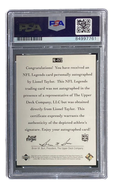 Featured is a Lionel Taylor Denver Broncos signed 1997 Upper Deck #AL-172 trading card. This card has been hand signed by Taylor and has been authenticated and encapsulated by PSA. This card would make a great addition to any sports memorabilia collection!. SPECIFICATIONS Autographed By: Lionel Taylor Team: Sport: Football Authentication: Professional Sports Authenticator (PSA)