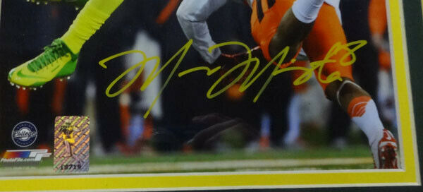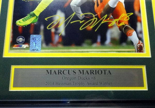 This is a framed 8x10 photo, approximately 15x18 with the frame, that has been hand signed by Marcus Mariota. It comes with the Marcus Mariota hologram & matching certificate of authenticity.