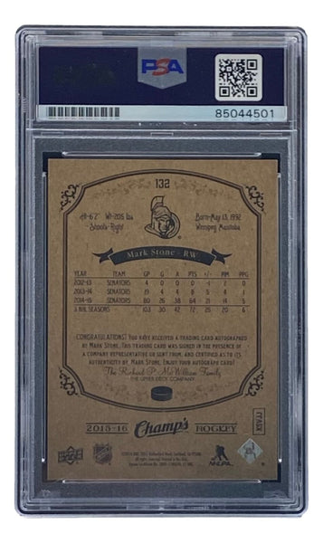 Featured is a Mark Stone signed 2015/16 Upper Deck Champs #132 Ottawa Senators trading card. This card has been hand signed by Stone and has been authenticated and encapsulated by PSA. This card would make a great addition to any sports memorabilia collection!. SPECIFICATIONS Autographed By: Mark Stone Team: Sport: Hockey Authentication: Professional Sports Authenticator (PSA)
