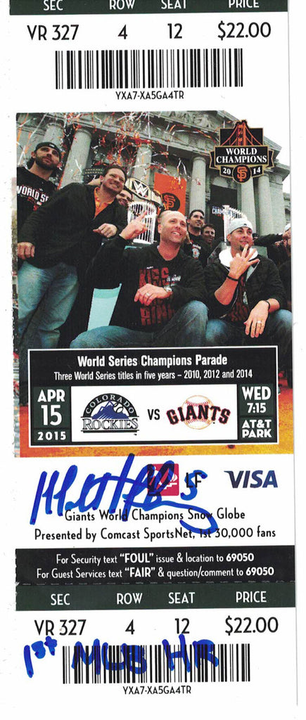 Matt Duffy Autographed/Signed San Francisco Giants Ticket 1st MLB HR JSA 24743 This is a San Francisco Giants vs Colorado Rockies Ticket from April 15th 2015 that was personally autographed by Matt Duffy with 1st MLB HR inscription. This ticket includes a certificate of authenticity from James Spence Authentication (JSA) and Denver Autographs.