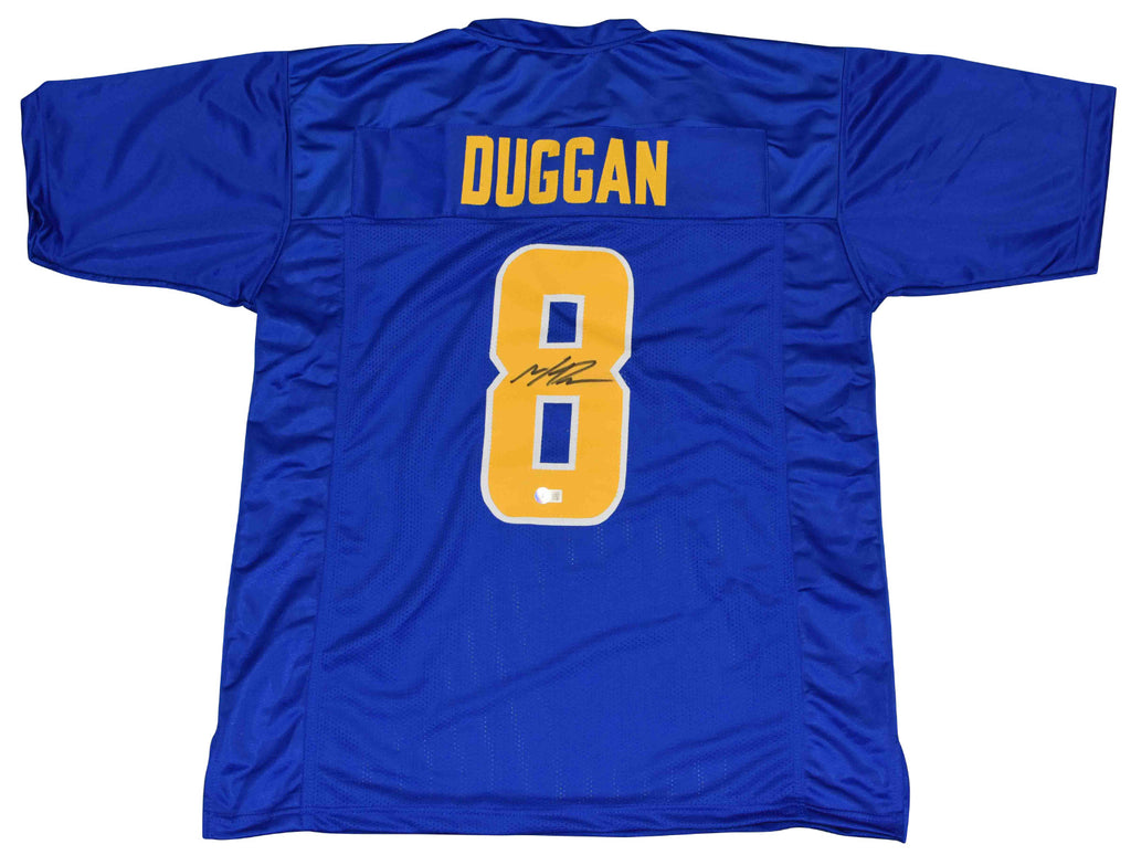 Max Duggan, quarterback for the Los Angeles Chargers, has hand signed this blue custom jersey at a private signing. Jersey is size XL and all letters/numbers are stitched on. This item is authenticated by Beckett Authentication Services and was signed in the presence of one of their representatives. Their tamper-evident hologram featuring a QR code and serial number is on the item. The authenticity can be verified online by entering the serial number or scanning the QR code.Item pictured may not be the exact item you will receive. It will be similar quality, and we guarantee your satisfaction.