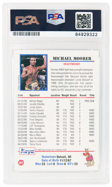 Michael Moorer signed 1991 Kayo boxing trading card #207 with 'Double M' inscription. The card has been authenticated and encapsulated by PSA/DNA and the number can be verified online.