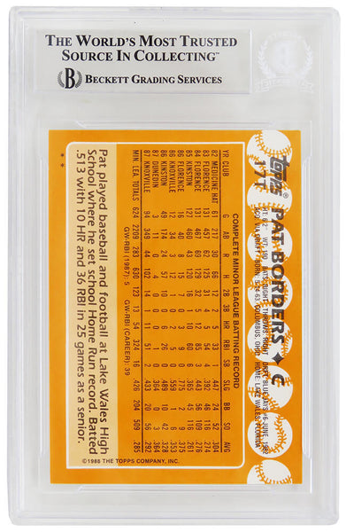 Pat Borders signed Toronto Blue Jays 1988 Topps Traded baseball rookie card #17T. The card has been authenticated and encapsulated by Beckett Authentic and the authentication number can be verified online. The image of the item is a stock photo, as we may have multiples of the item in stock. The Slabbed Card you will receive will be of the card described. (Same grade, Same authentication) You may or may not receive the exact Beckett serial number on the slab label shown in image.