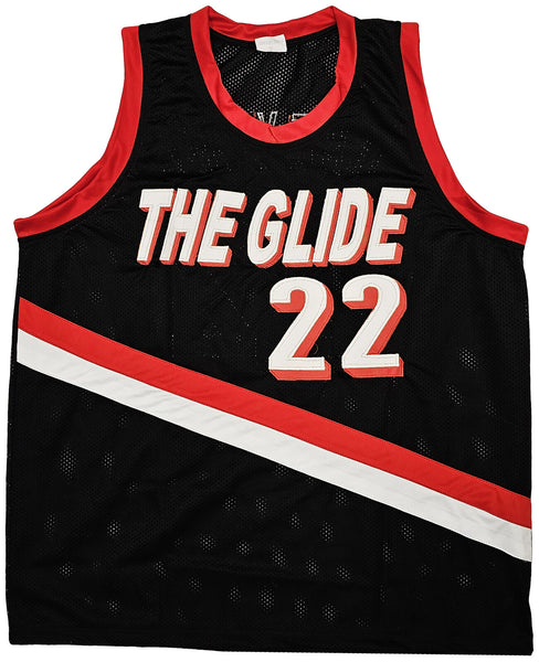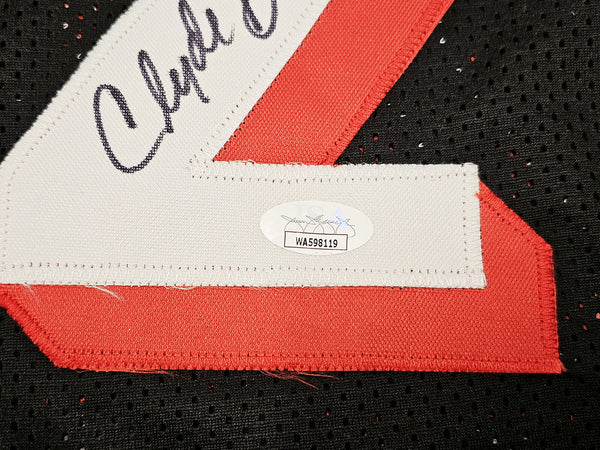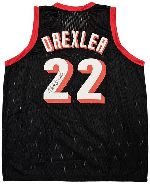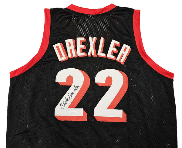 PORTLAND TRAIL BLAZERS CLYDE DREXLER AUTOGRAPHED BLACK JERSEY JSA STOCK #215756