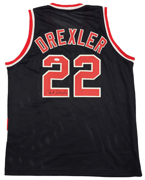 This is a Black & Red Jersey that has been hand signed by Clyde Drexler. This is a custom jersey with no name brand. The approximate size is XL. It has nice sewn in name and numbers. This item has been certified authentic by JSA and comes with their tamper-proof sticker and matching certificate of authenticity.