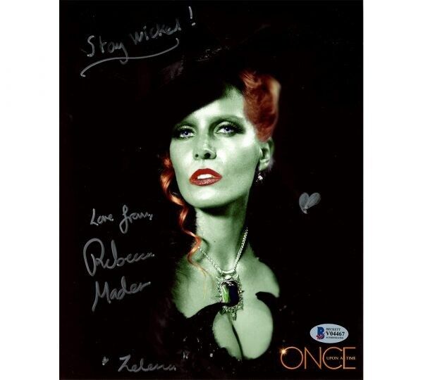 A Once Upon a Time Unframed 8x10 Photo - Green Face hand signed by Rebecca Mader. The item and signature are in excellent condition. In addition to signing her name, Rebecca also inscribed "Stay Wicked" on the item. Rebecca is best known as her role as Zelena, the Wicked Witch of the West in the Once Upon a Time TV series although she has made appearances in many other shows as well. AUTHENTICATION: The item is accompanied by a Beckett Certificate of Authenticity - Beckett Serial Numbered and Databased Hologram