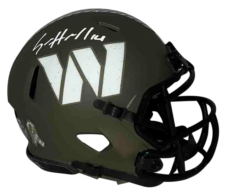 Sam Howell, quarterback for the Washington Commanders, has hand signed this Commanders Riddell Speed Salute to Service mini helmet at a private signing. This item is authenticated by Beckett Authentication Services and was signed in the presence of one of their representatives. Their tamper-evident hologram featuring a QR code and serial number is on the item. The authenticity can be verified online by entering the serial number or scanning the QR code.Item pictured may not be the exact item you will receive. It will be similar quality, and we guarantee your satisfaction.