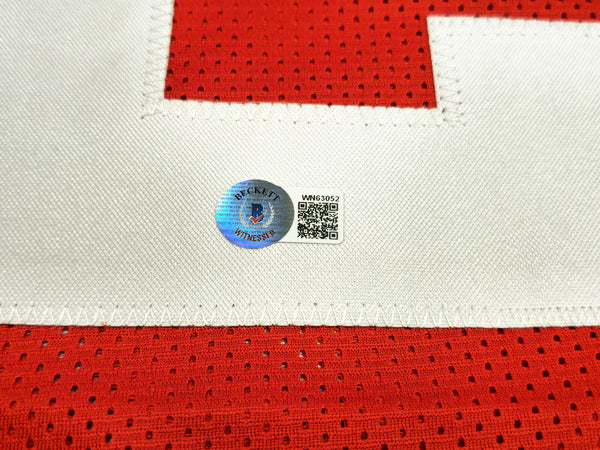 This is a Red Jersey that has been hand signed by Frank Gore. This is a custom jersey with no name brand. The approximate size is XL. It has nice sewn in name and numbers. This item has been witnessed and certified authentic by Beckett Authentication (BAS) and comes with their tamper-proof witness sticker.