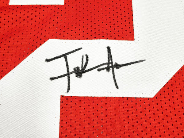 This is a Red Jersey that has been hand signed by Frank Gore. This is a custom jersey with no name brand. The approximate size is XL. It has nice sewn in name and numbers. This item has been certified authentic by JSA and comes with their tamper-proof sticker BUT IS MISSING the matching certificate of authenticity.