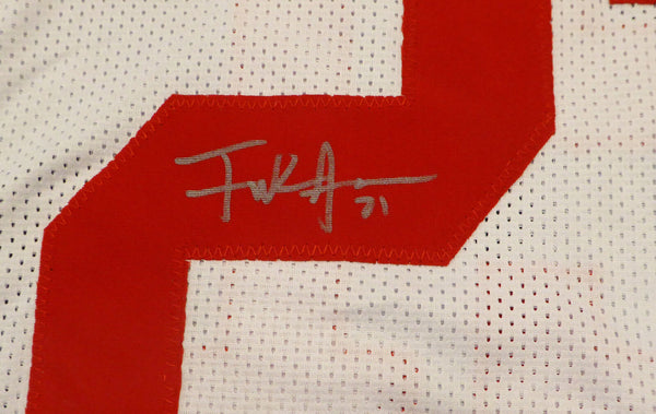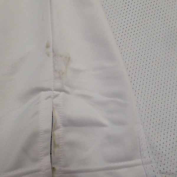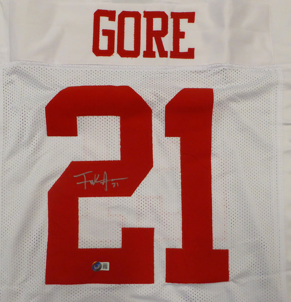This is a White Jersey that has been hand signed by Frank Gore. This is a custom jersey with no name brand. The approximate size is XL. It has nice sewn in name and numbers. NOTE: There is a stain on the jersey, as shown in the pictures. This item has been certified authentic by Beckett Authentication (BAS) and comes with their tamper-proof QR Code sticker that can be verified on the Beckett-authentication.com.