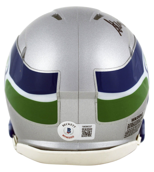 This Autographed 1983-01 Throwback Speed Mini Helmet with the inscription of "HOF 95" has been Personally Signed by Steve Largent of the Seattle Seahawks. This item is 100% Authentic to include a hologram by Beckett Authentication Services. This item will come with the new Beckett Authentication hologram that has a scannable QR code rather than the traditional COA. If you would like to have a COA, you are welcome to reach out to Beckett for a printed certification once you receive your item. This is a BAS Witnessed Protection Program item which means a Beckett Authentication Service representative was present when this item was being signed. We conducted an autograph signing with Steve Largent where multiples of the same item were signed. While the photographs are representative of this item, the size, placement and strength of the signature may vary. Each item is hand signed, therefore, each autograph is unique. This item can be verified through BAS Witnessed.