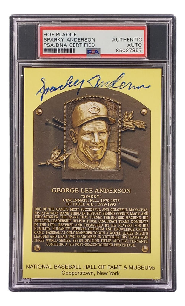 Featured is a Sparky Anderson (Cincinnati Reds) signed 4x6 Hall Of Fame plaque card. This card has been hand signed by Anderson and has been authenticated and encapsulated by PSA/DNA. This card would make a great addition to any sports memorabilia collection! SPECIFICATIONS Autographed By: Sparky Anderson Team: Cincinnati Reds Sport: Baseball Authentication: Professional Sports Authenticator (PSA)