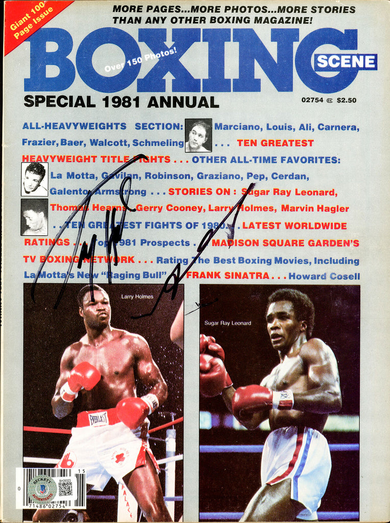 This is a Boxing Scene magazine that has been hand signed by Sugar Ray Leonard & Larry Holmes. There is a smudge in the signature as shown. This item has been certified authentic by Beckett Authentication (BAS) and comes with their tamper-proof hologram.