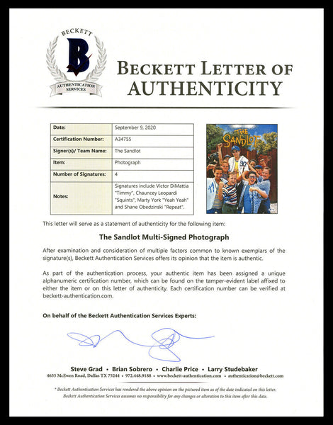 This is an 11x14 Photo that has been hand signed by 4 members from the movie, "The Sandlot".A Signatures include Victor DiMattia "Timmy", Chauncey Leopardi "Squints", Marty York "Yeah Yeah" & Shane Obedzinski "Repeat". It has been certified authentic by Beckett Authentication (BAS) and comes with their sticker and matching full page certificate of authenticity.