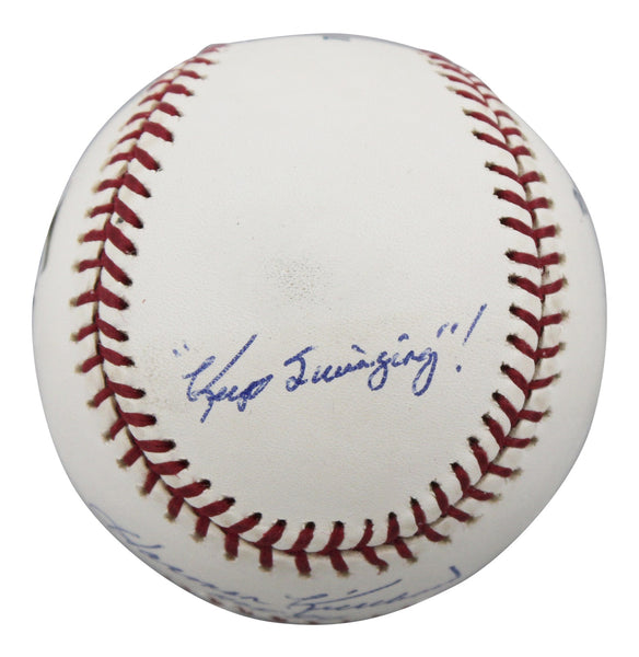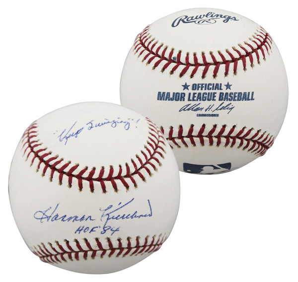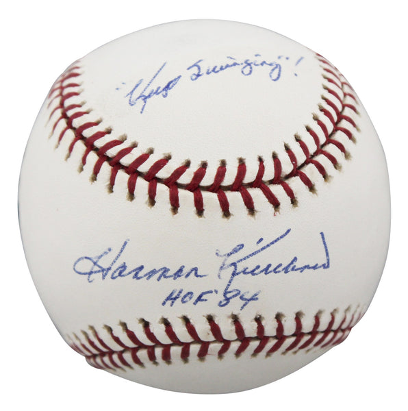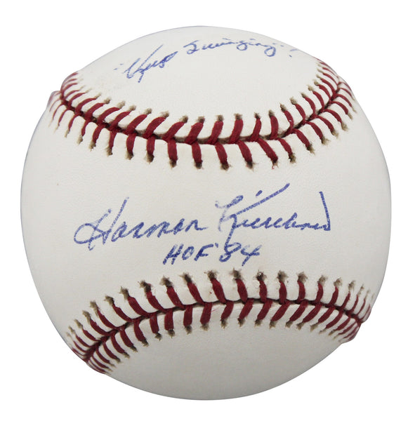 This Autographed Baseball with the inscription of "HOF 84, Keep Swinging" has been Personally Signed by Harmon Killebrew of the Minnesota Twins. This item is 100% Authentic to include a hologram by Beckett Authentication Services. This item will come with an affixed Beckett Authentication Services (BAS) authentication sticker, which includes a scannable QR code to verify authenticity. Please note that Beckett no longer provides serial-numbered COA cards, and the attached BAS sticker will serve as the complete authentication for this item. The authenticity can be verified on Beckett Authentication Services website.
