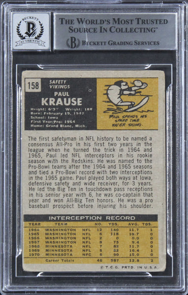 This Autographed Auto Graded Gem Mint 10! 1971 Topps #158 Card with the inscription of "HOF 98" has been Personally Signed by Paul Krause of the Minnesota Vikings. This item is 100% Authentic, it comes slabbed and authenticated by Beckett Authentication Services. The authenticity can be verified on Beckett Authentication Services website.
