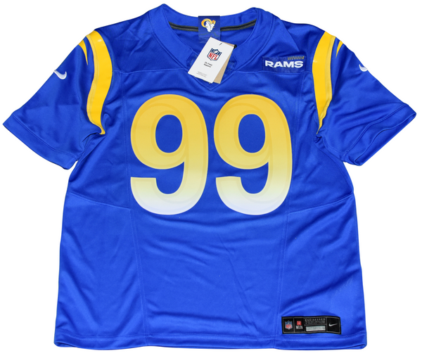 Aaron Donald, former All-Pro defensive tackle for the Los Angeles Rams, has hand signed this blue Nike Limited jersey at a private signing. Jersey is new with tags attached and all letters/numbers are stitched on. This item is authenticated by Beckett Authentication Services, one of the best authenticators in the industry. Their tamper-evident hologram featuring a QR code and serial number is on the item. The authenticity can be verified online by entering the serial number or scanning the QR code.Item pictured may not be the exact item you will receive. It will be similar quality, and we guarantee your satisfaction.