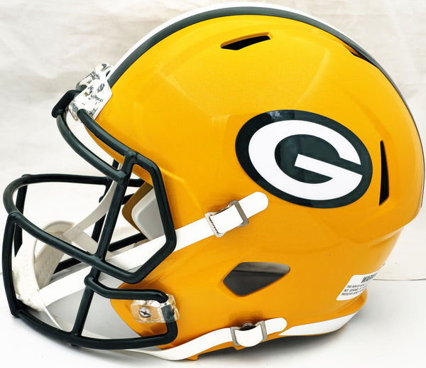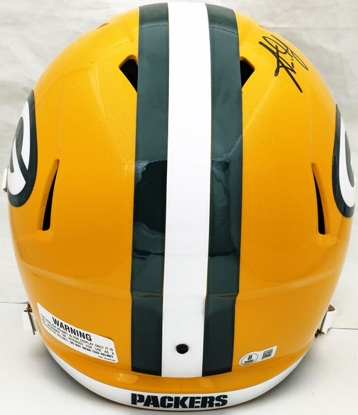 This is a Green Bay Packers Yellow Full Size Speed Replica Helmet that has been hand signed by Aaron Jones. This item has been witnessed and certified authentic by Beckett Authentication (BAS) and comes with their tamper-proof witness sticker.