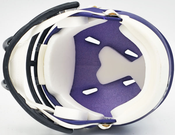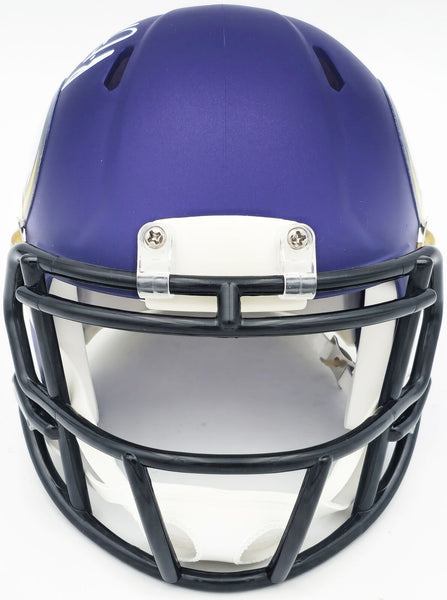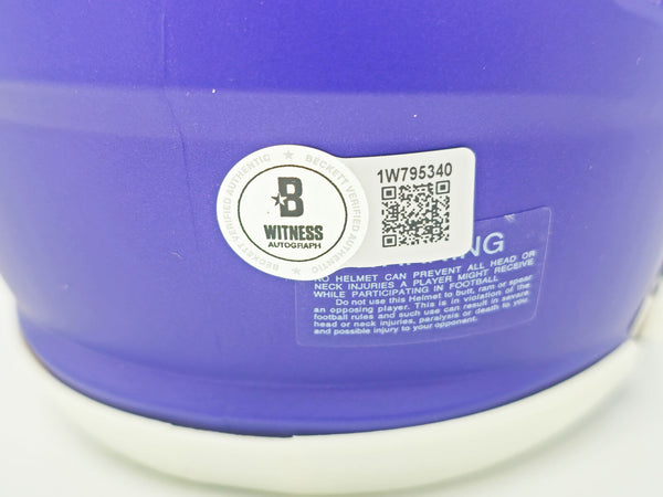 This is a Minnesota Vikings Purple Speed Mini Helmet that has been hand signed by Aaron Jones. This item has been witnessed and certified authentic by Beckett Authentication (BAS) and comes with their tamper-proof witness sticker.