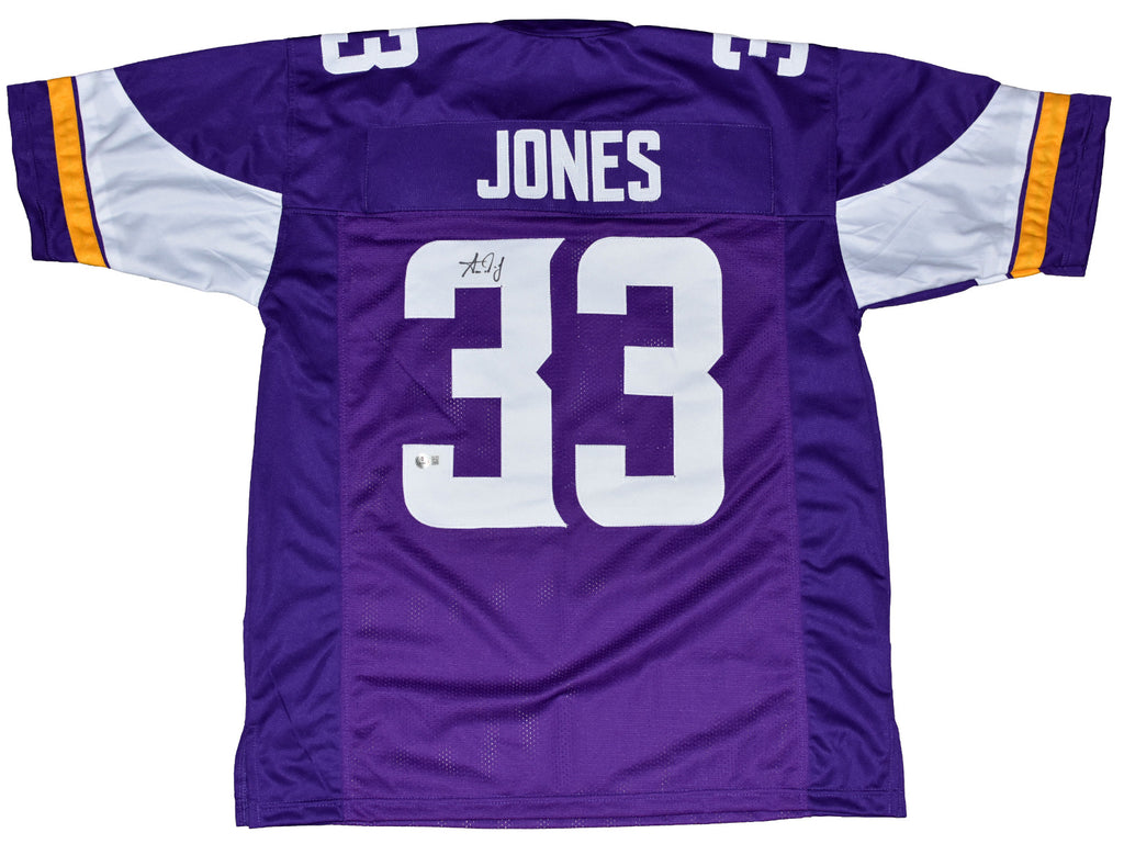Aaron Jones, star running back for the Minnesota Vikings, has hand signed this purple custom jersey at a private signing. Jersey is size XL and all letters/numbers are sewn-on. This item is authenticated by Beckett Authentication Services and was signed in the presence of one of their representatives. Their tamper-evident hologram featuring a QR code and serial number is on the item. The authenticity can be verified online by entering the serial number or scanning the QR code.Item pictured may not be the exact item you will receive. It will be similar quality, and we guarantee your satisfaction.