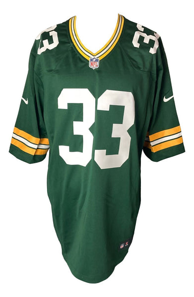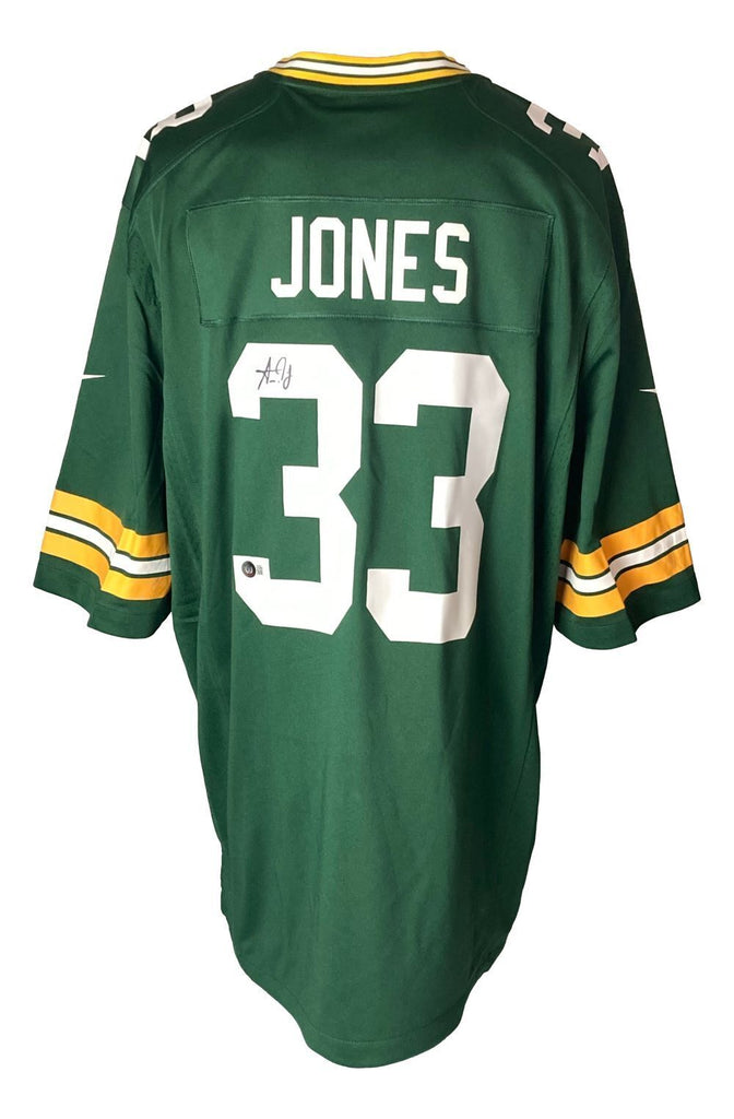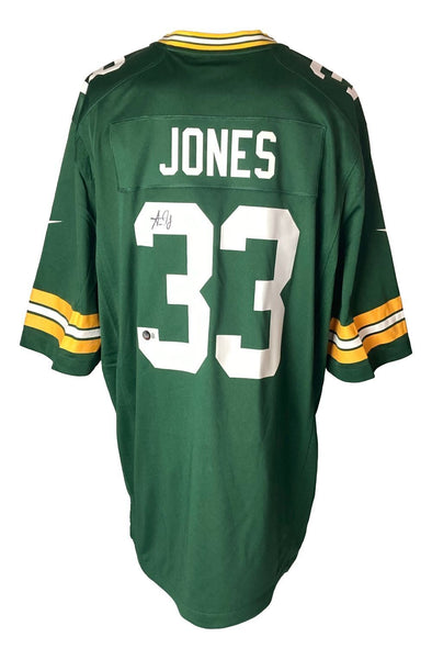 Featured is an Aaron Jones signed Green Bay Packers Nike game replica football jersey. This jersey has been hand signed by Jones and comes with the Beckett hologram and certificate of authenticity. This jersey is size XXL. This jersey would make a great addition to any sports memorabilia collection! SPECIFICATIONS Autographed By: Aaron Jones Team: Green Bay Packers Sport: Football Authentication: Beckett Grading Services