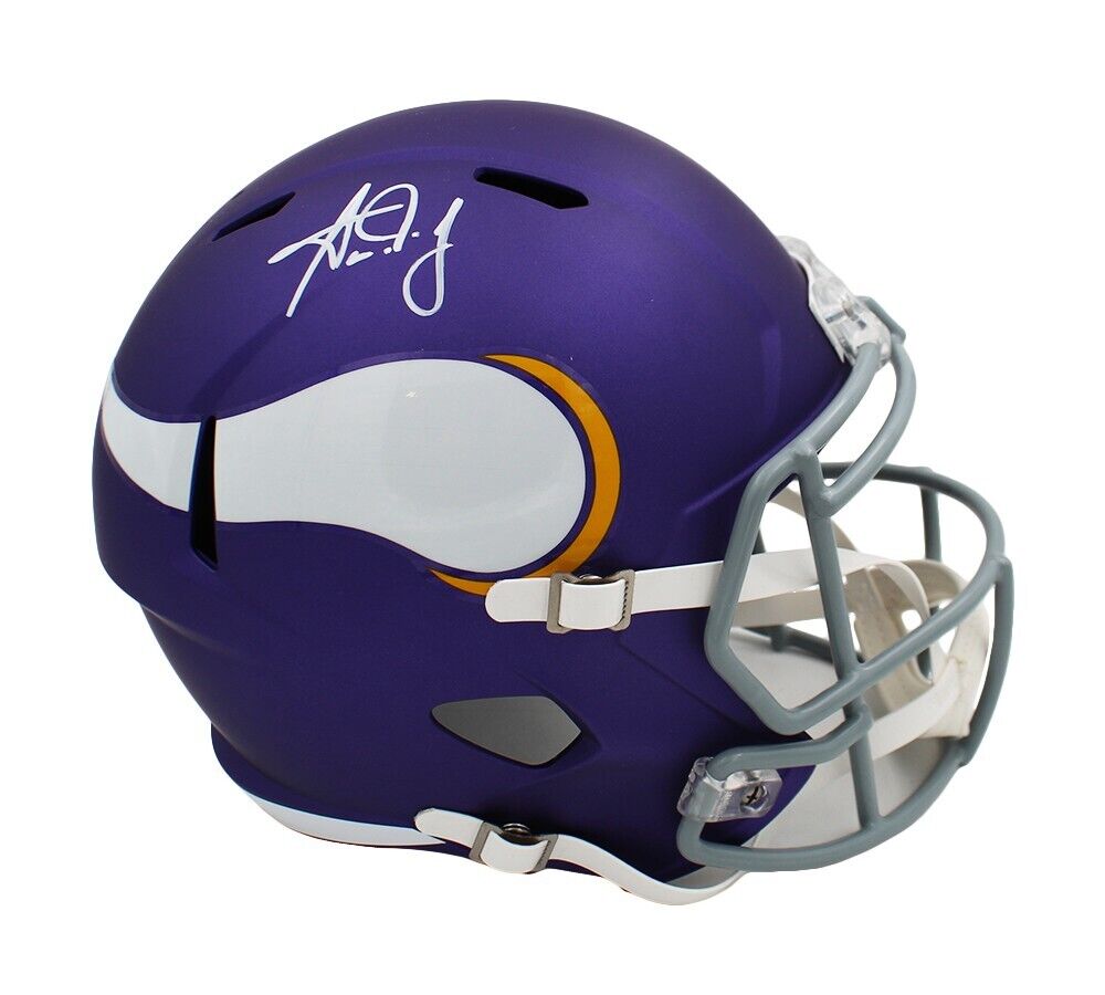 A Minnesota Vikings Speed Replica Alternate NFL Helmet hand signed by Aaron Jones. The item and signature are in excellent condition. Aaron is a professional football running back for the Minnesota Vikings. He was drafted by the Green Bay Packers in 2017. He is a a Pro Bowler and and NFL rushing touchdown co-leader. AUTHENTICATION: The item is accompanied by a Beckett Serial Numbered and Databased Hologram