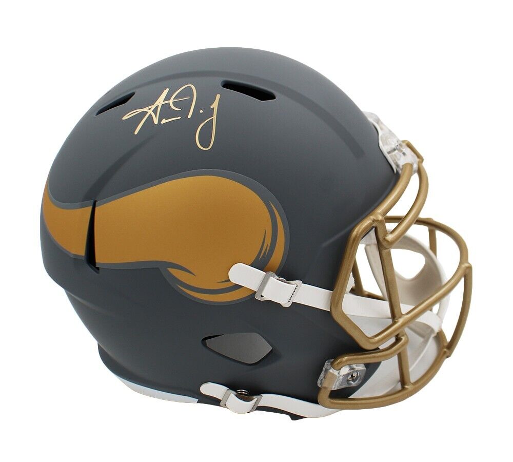 A Minnesota Vikings Speed Replica Slate NFL Helmet hand signed by Aaron Jones. The item and signature are in excellent condition. Aaron is a professional football running back for the Minnesota Vikings. He was drafted by the Green Bay Packers in 2017. He is a a Pro Bowler and and NFL rushing touchdown co-leader. AUTHENTICATION: The item is accompanied by a Beckett Serial Numbered and Databased Hologram