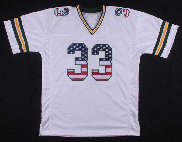 Custom on-field style jersey. Everything is sewn on, size XL. Hand-signed in black paint pen by Aaron Jones. The lot / autograph(s) includes an official Beckett Authentication Services serially numbered hologram and matching COA for authenticity purposes. The signing of this item was witnessed by Beckett.Authentication: Beckett COACustom on-field style jerseys are a more affordable option for autograph seekers. These jerseys do not have any brand name or tags and are made in the Philippines. They feature stitched on names and numbers and are made to look very similar to the on-field jerseys that the players wear. These custom jerseys are very commonly used in the memorabilia industry.
