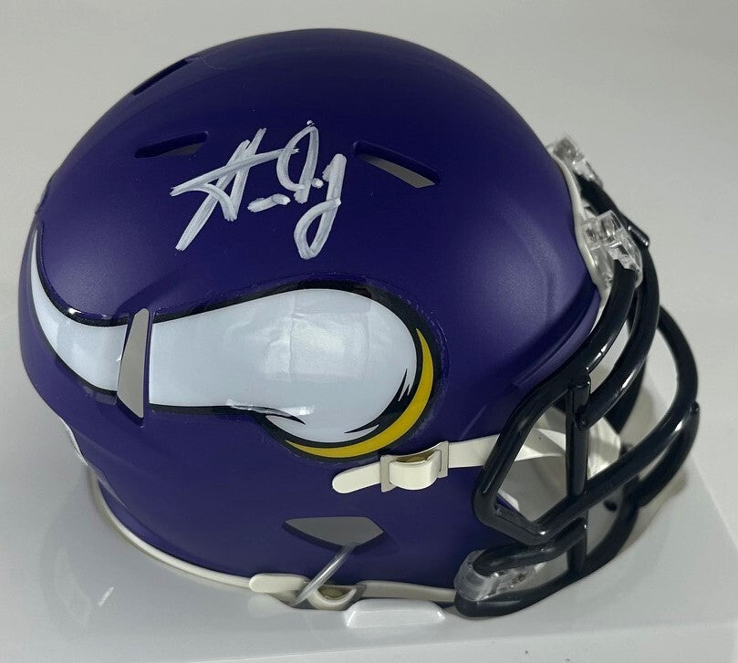 Riddell Speed Mini Helmet hand signed by Minnesota Vikings Running Back AARON JONES. The signature is in White paint pen. This item was signed at a private signing with us and would make a great addition to any Vikings collection! This item is guaranteed to be 100% authentic and will include a COA hologram from Beckett authentication.