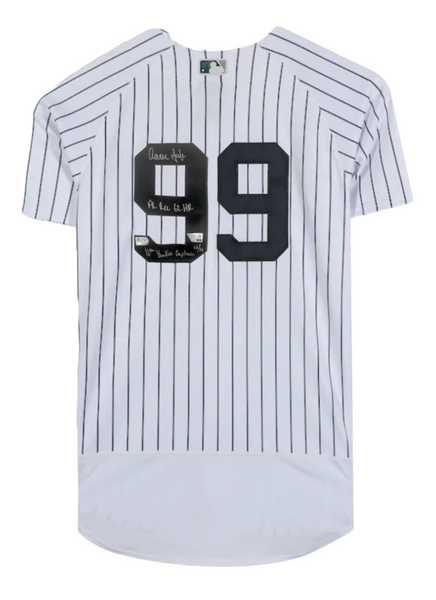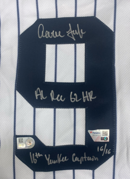 This authentic New York Yankees jersey has been personally hand-signed by Aaron Judge with the inscriptions "AL Rec 62 HR" and "16th Yankee Captain." It has been obtained under the auspices of the MLB Authentication Program and can be verified by its numbered hologram at MLB.Com. It also comes with an individual numbered, tamper-evident hologram from Fanatics Authentic. This process helps to ensure that the product purchased is authentic and eliminates any possibility of duplication or fraud.This jersey is limited to just 16. This listing is for number "16" of the edition. Made in the USA Personally Autographed by Aaron Judge Fanatics Authentic Presented by Mounted Memories Includes tamper-evident hologram to ensure authenticity Officially licensed This product is guaranteed authentic and includes a Fanatics Certificate of Authenticity and an accompanying tamper-evident Fanatics Hologram.