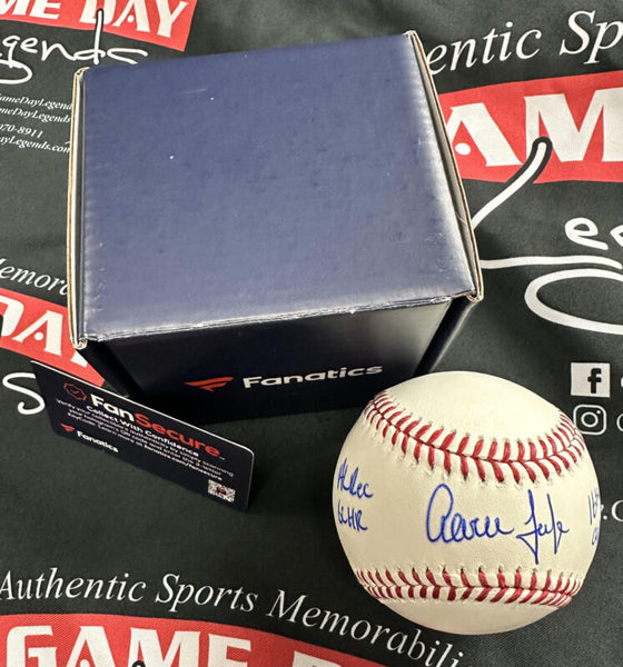 This Official MLB Baseball has been personally hand-signed by Aaron Judge with the inscriptions "AL Rec 62 HR" and "16th Yankee Captain." It has been obtained under the auspices of the MLB Authentication Program and can be verified by its numbered hologram at MLB.Com. It also comes with an individual numbered, tamper-evident hologram from Fanatics Authentic. This process helps to ensure that the product purchased is authentic and eliminates any possibility of duplication or fraud.This ball is limited to just 16. This listing is for number "11" from the edition. Made in the USA Personally Autographed by Aaron Judge Fanatics Authentic Presented by Mounted Memories Includes tamper-evident hologram to ensure authenticity Officially licensed This product is guaranteed authentic and includes a Fanatics Certificate of Authenticity and an accompanying tamper-evident Fanatics Hologram.