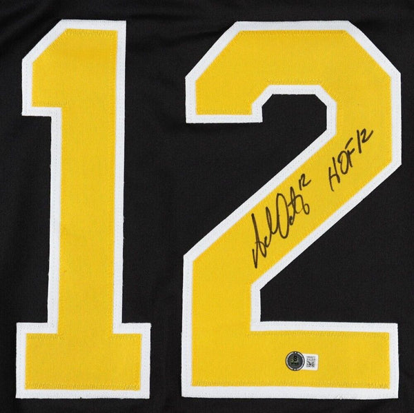 Custom on-ice style jersey. Everything hand-sewn on, size XL. Hand-signed in black felt tip pen by Adam Oates (Flyers, Redwings, Blues, Ducks, Capitols, Oilers, Bruins). The autograph includes an official Beckett Authentication Services serially numbered hologram and QR Code card for authenticity purposes. The signing of this item was witnessed by Beckett.Authentication: Beckett Hologram with QR Code card