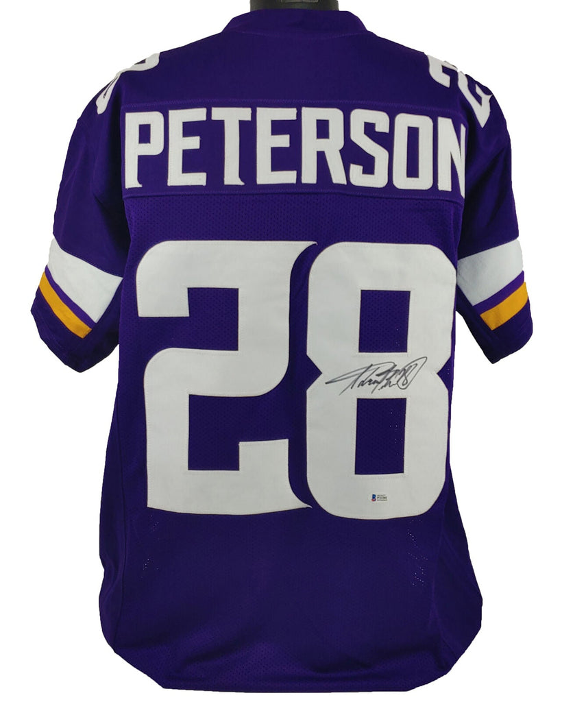This Autographed Purple Jersey has been Personally Signed by Adrian Peterson of the Minnesota Vikings. This item is 100% Authentic to include a hologram by Beckett Authentication Services. This item will come with the new Beckett Authentication hologram that has a scannable QR code rather than the traditional COA. If you would like to have a COA, you are welcome to reach out to Beckett for a printed certification once you receive your item. This is a BAS Witnessed Protection Program item which means a Beckett Authentication Service representative was present when this item was being signed. We have multiples of this same item. While the photographs are representative of this item, the size, placement and strength of the signature may vary. Each item is hand signed, therefore, each autograph is unique. This is a X-Large sized, non-branded, custom-stitched Jersey.