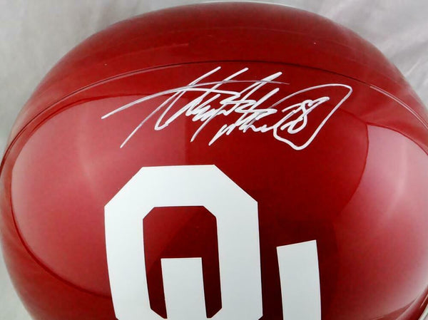 Adrian Peterson Autographed Oklahoma Sooners F/S Helmet - Beckett W Auth *White This is a hand autograph of Adrian Peterson of the Oklahoma Sooners on a Riddell Football Full Size Replica Helmet. This item has a Beckett Witness Authentication, which comes with a Beckett numbered sticker and a matching Certificate of Authenticity. You can view this item on the Beckett Authentication website and it shows when and where the item was signed. It was signed either at a public autograph appearance or a private signing. This is a stock photo of the item. Although you may not receive this exact item, the item you receive is virtually identical and brand new in great shape.