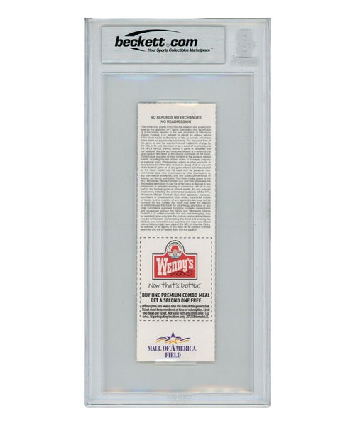Adrian Peterson Autographed/Signed 12/30/2012 Slab Ticket Stub Beckett 40881 The number in the listing title is just an inventory sku for our records and is not the authentication number. The item pictured is a stock photo unless otherwise noted. This is a Minnesota Vikings slabbed ticket stub dated 12/30/2012 vs. Green Bay Packers that was personally autographed by Adrian Peterson with "2097 yards" inscription. Includes a certificate of authenticity from Beckett Authentication Services (BAS) and Denver Autographs.