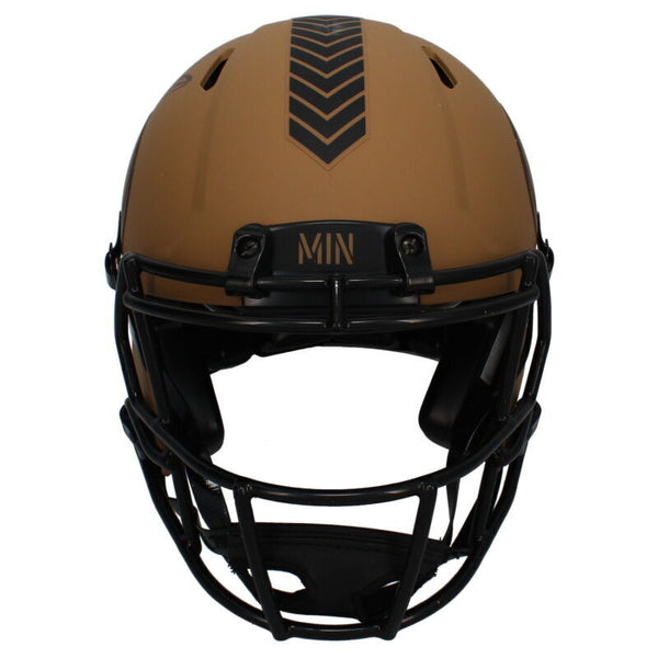 This Minnesota Vikings Salute to Service authentic Riddell Speed helmet has been personally hand-signed by Adrian Peterson. It comes with an individually numbered, tamper-evident hologram from Beckett Authentic. To ensure authenticity, the hologram can be reviewed online. This process helps to ensure that the product purchased is authentic and eliminates any possibility of duplication or fraud.