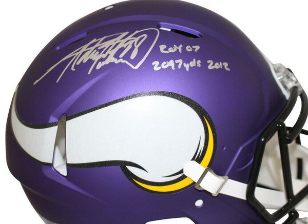 Adrian Peterson Signed Minnesota Vikings Authentic Speed Helmet 2 Insc JSA 24998 This is a Minnesota Vikings full size authentic/proline speed helmet that was personally autographed by Adrian Peterson with ROY 07 and 2097 yds 2012 inscriptions. This helmet includes a certificate of authenticity from James Spence Authentication (JSA) and Denver Autographs.