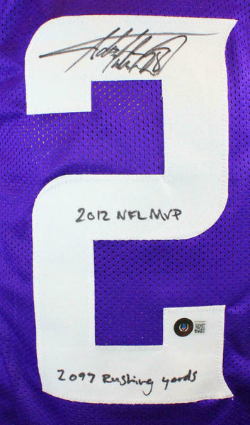 Adrian Peterson Autographed Purple Pro Style Jersey w/2 insc.- Beckett W Hologram *Black *2 THIS IS NOT AN NFL JERSEY. THIS HAS NO TAGS, NO LOGOS, NO EMBLEMS. This is a hand autograph of Adrian Peterson on a custom made (non name brand) authentic style jersey with stitched letters and numbers. Inscribed 2012 NFL MVP, 2,097 Rushing Yards. This item has a Beckett Witnessed Authentication, which comes with a numbered hologram and a basic Beckett Certificate of Authenticity. You can view this item on the Beckett Authentication website. It was signed either at a public autograph appearance or a private signing. This is a stock photo of the item. Although you may not receive this exact item, the item you receive is virtually identical, brand new, and in great shape. Jersey size is XL.