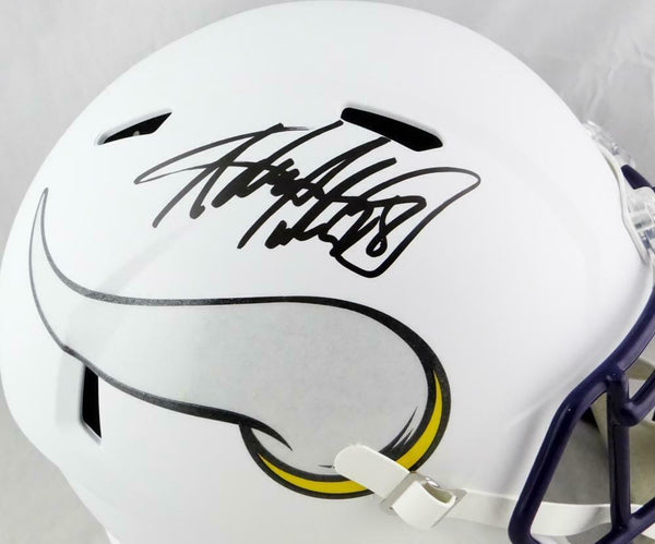 Adrian Peterson Signed Minn Vikings F/S Flat White Speed Helmet- Beckett *Black This is a hand autograph of Adrian Peterson of the Minnesota Vikings on a Riddell Football Full Size Flat White Speed Replica Helmet. This item has a Beckett Authentication, which comes with a Beckett numbered and a matching Beckett Certificate of Authenticity. You can view this item on the Beckett Authentication website and it shows when and where the item was signed. It was signed either at a public autograph appearance or a private signing. This is a stock photo of the item. Although you may not receive this exact item, the item you receive is virtually identical and brand new in great shape.
