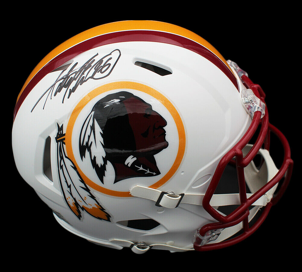 A Washington Speed Authentic White Matte NFL Helmet hand signed by Adrian Peterson. The item and signature are in excellent condition. Adrian was a 2007 First Round Draft Pick, a 7x Pro Bowler and 5x First Team All-Pro. AUTHENTICATION: The item is accompanied by a Beckett Certificate of Authenticity - Beckett Serial Numbered and Databased Hologram