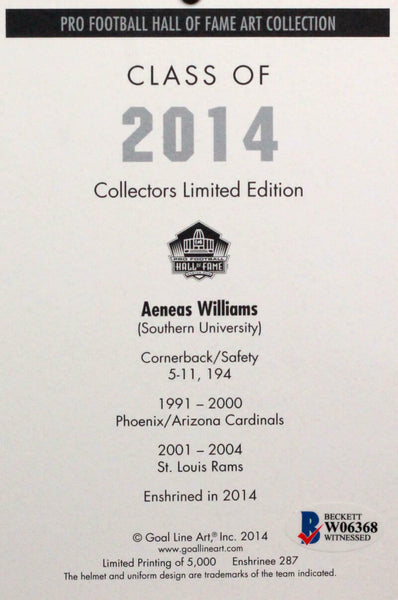 Aeneas Williams Signed Arizona Cardinals Goal Line Art Card W/ HOF- Beckett Witness This is a hand autographed Goal Line Art Card of Aeneas Williams of the Arizona Cardinals. This item has a Beckett Witnessed Authentication, which comes with a numbered and a matching Beckett Certificate of Authenticity. You can view this item on the Beckett Authentication website and it will tell you when and where it was signed. It was signed either at a public autograph appearance or a private signing. This is a stock photo of the item. Although you may not receive this exact item, the item you receive is virtually identical and brand new in great shape.